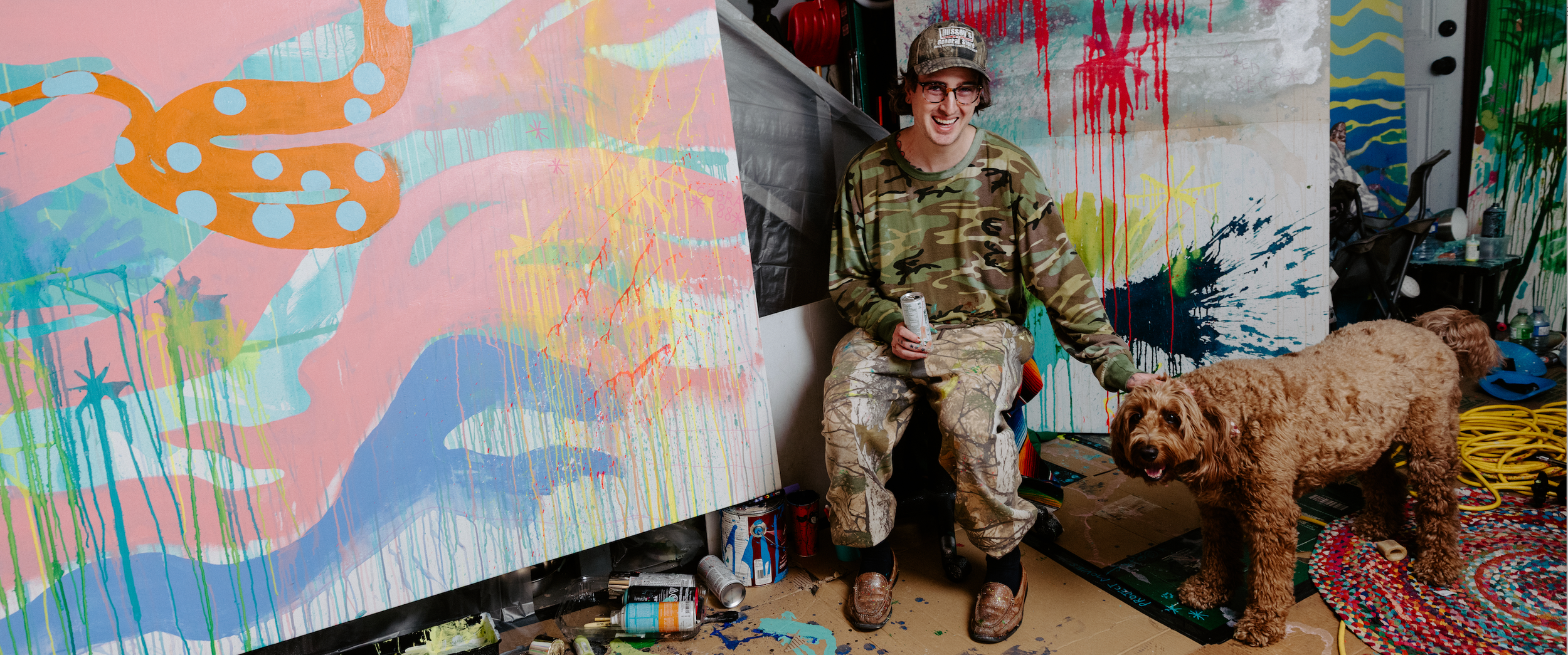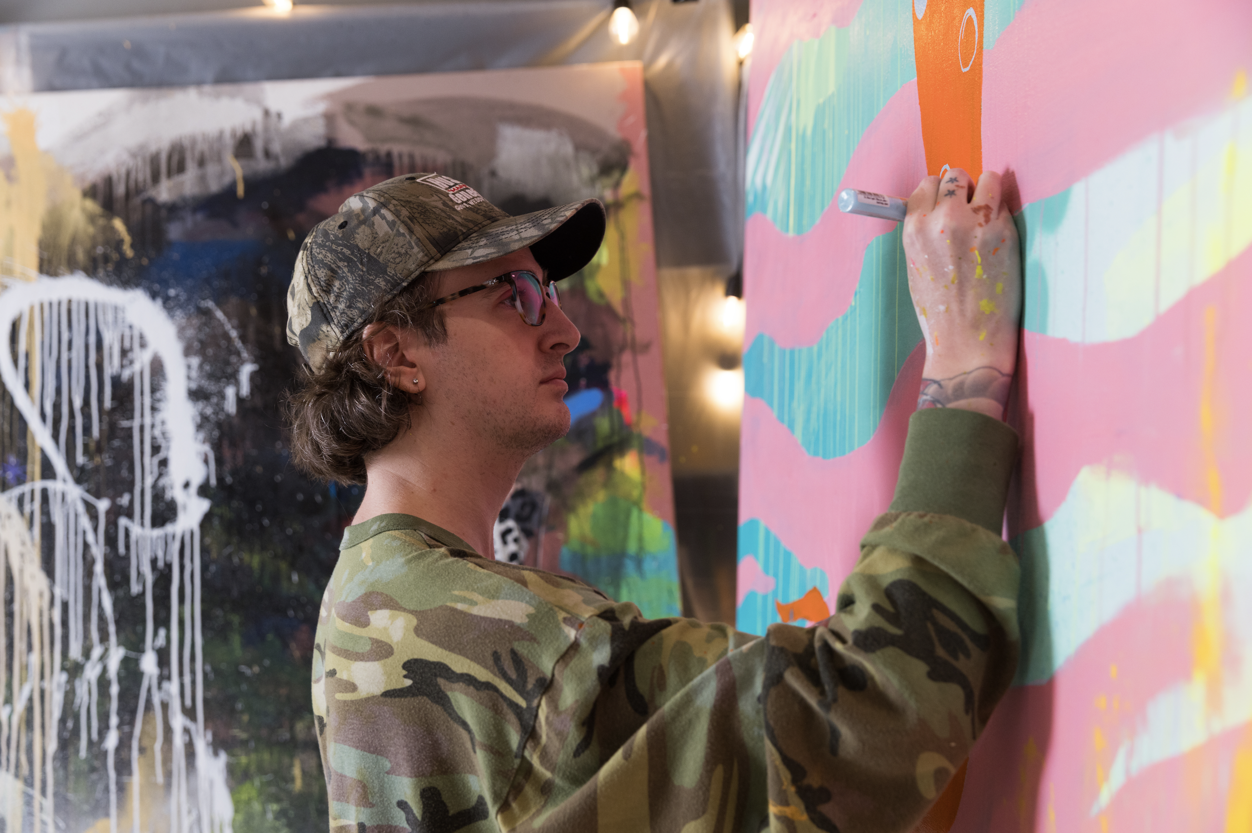 “My use of ethereal gesture and expressionist forms has since set the tone for my highly charged prismatic color field paintings. I aim to rethink the very parameters of contemporary painting, and my work touches on many pertinent and pressing concerns around the practice of chromatic mark making, and how these relate to artistic ideals in the 21st century. My martyristic paintings inhabit the space where consciousness descends into dream; where pattern and color expand to become an immersive sensory experience. In this celestial space, I seek to examine this dream-like suppression of recognizable imagery and capture the visceral sensations with the sublime nature of drips and the colorfield. Multiple layers of tension – between the duality of conscious and subconscious surrealist automatism, flat surface and illusory depth – propel my Aquarian desire to use visual cues as a means of stimulating ascending metaphysical sensation.”